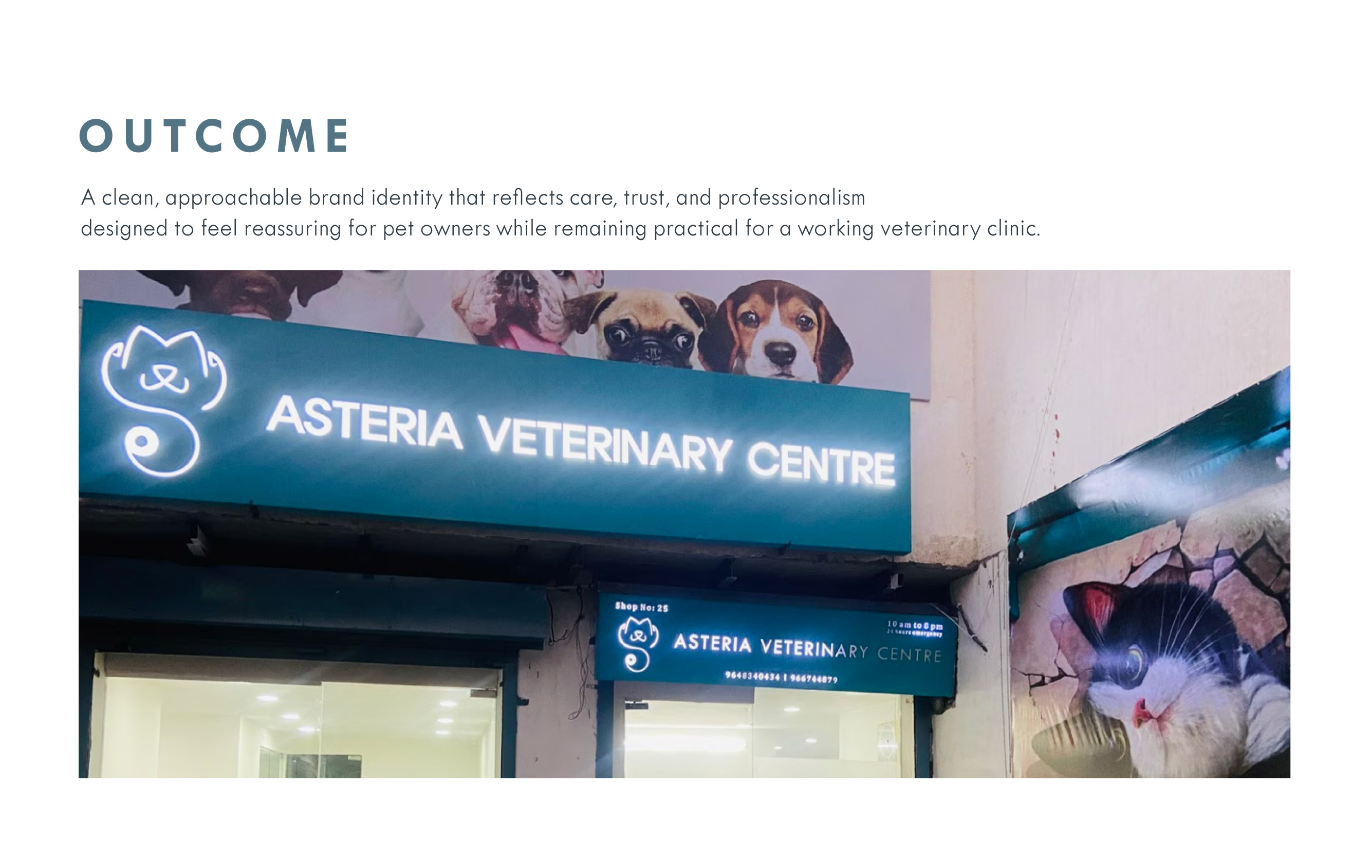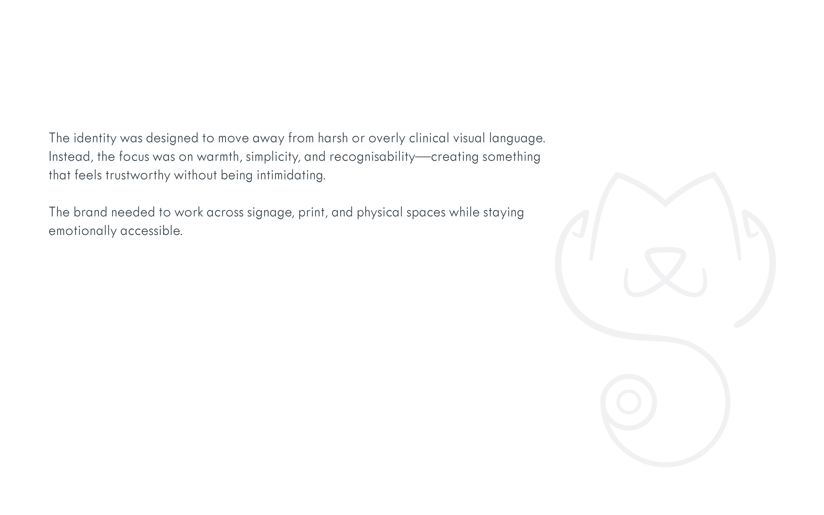 A brand identity designed for a neighbourhood veterinary clinic, focused on warmth, clarity, and approachability. The project involved creating a logo system and supporting visual language that feels friendly to pet owners while remaining practical for everyday clinical use.