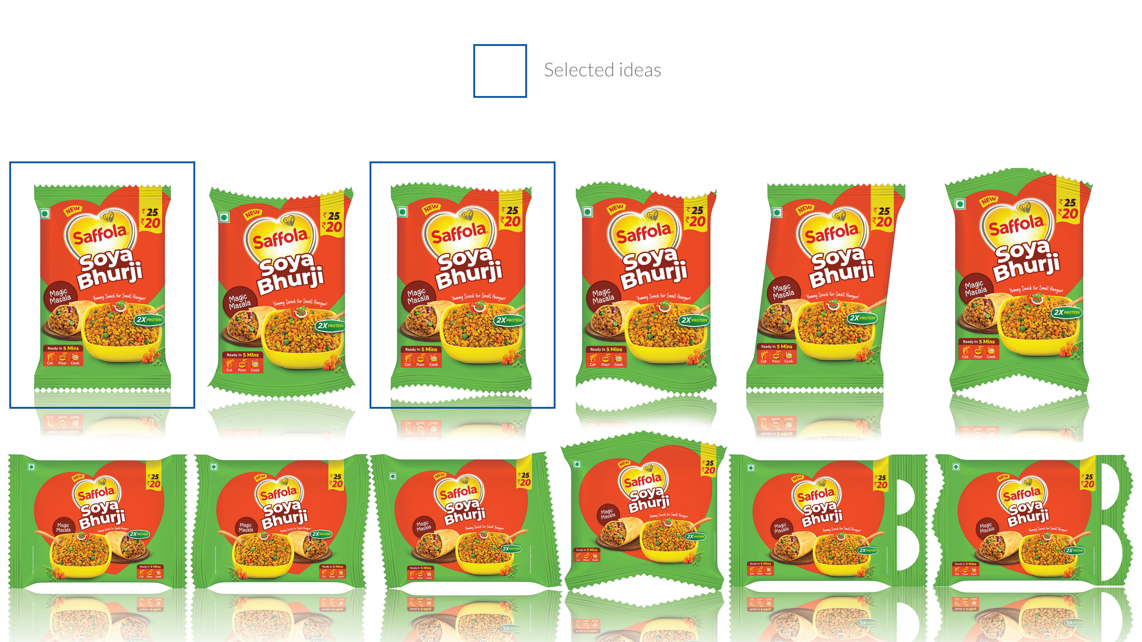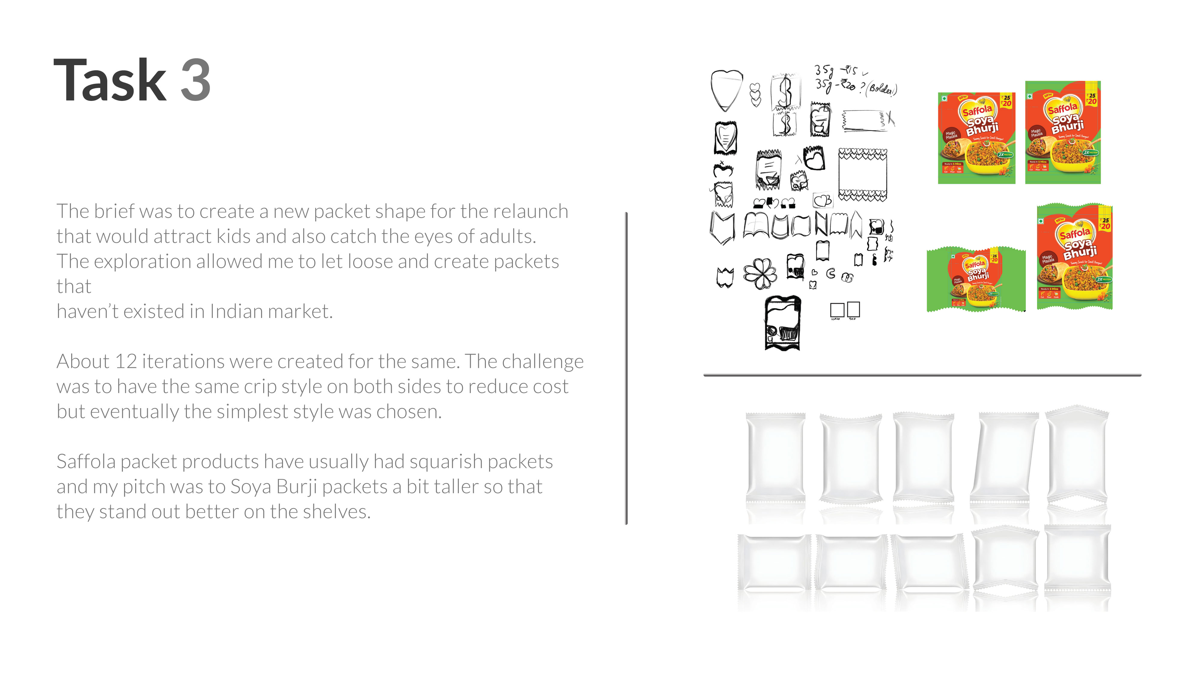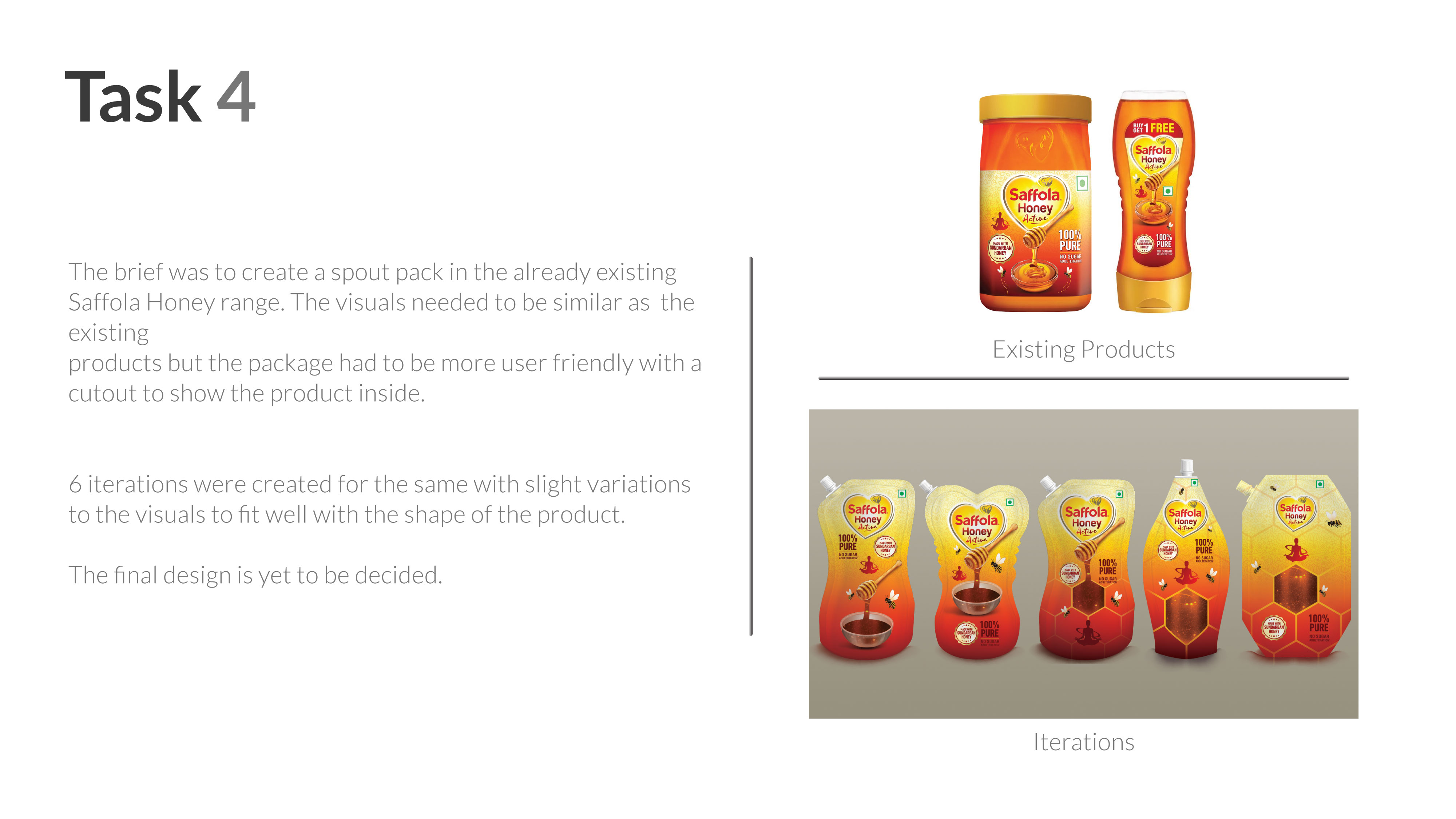 The work included packaging design for Parachute Advanced hair serums, some of which went on to be produced and are currently sold internationally. Alongside this were exploratory concepts for Saffola Honey pouches and Soya Bhurji packaging that remained unimplemented, reflecting the realities of corporate decision-making.
