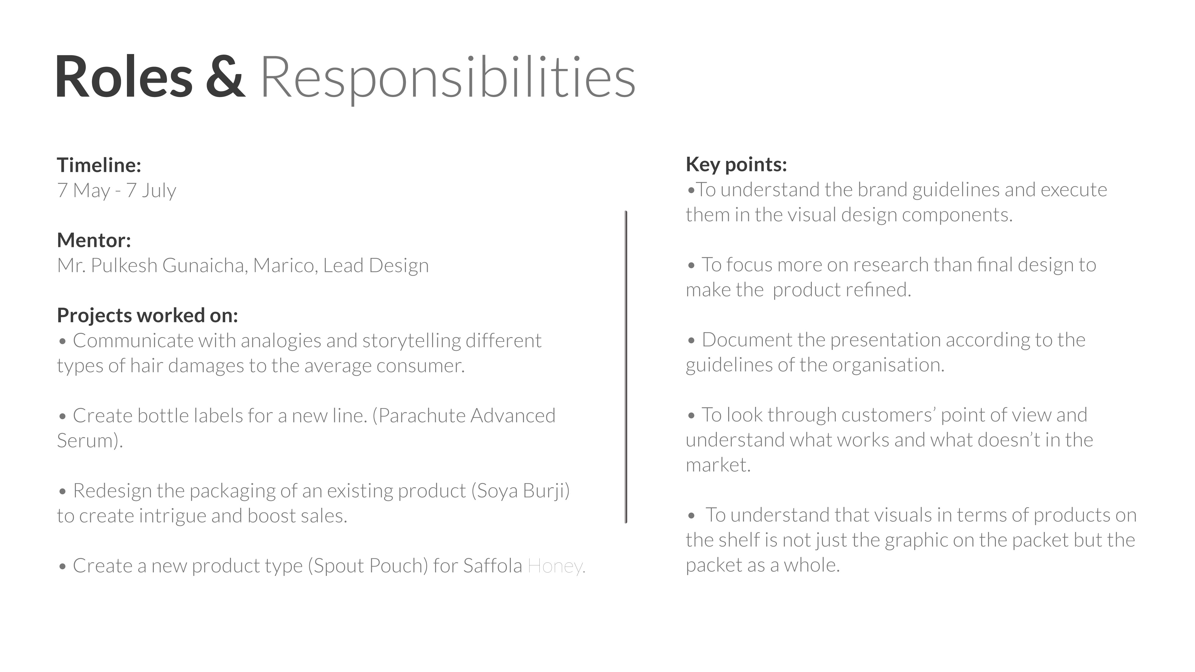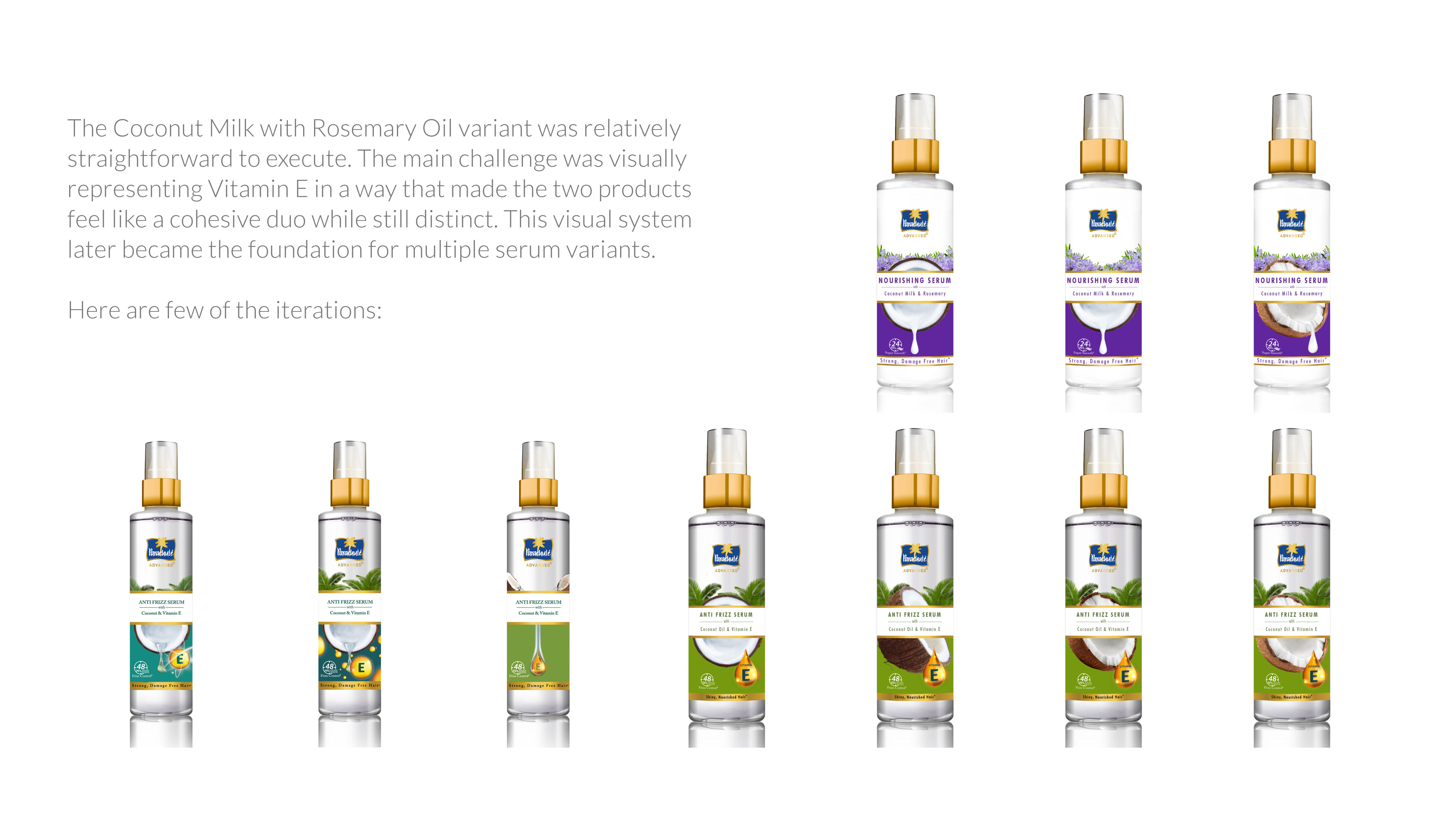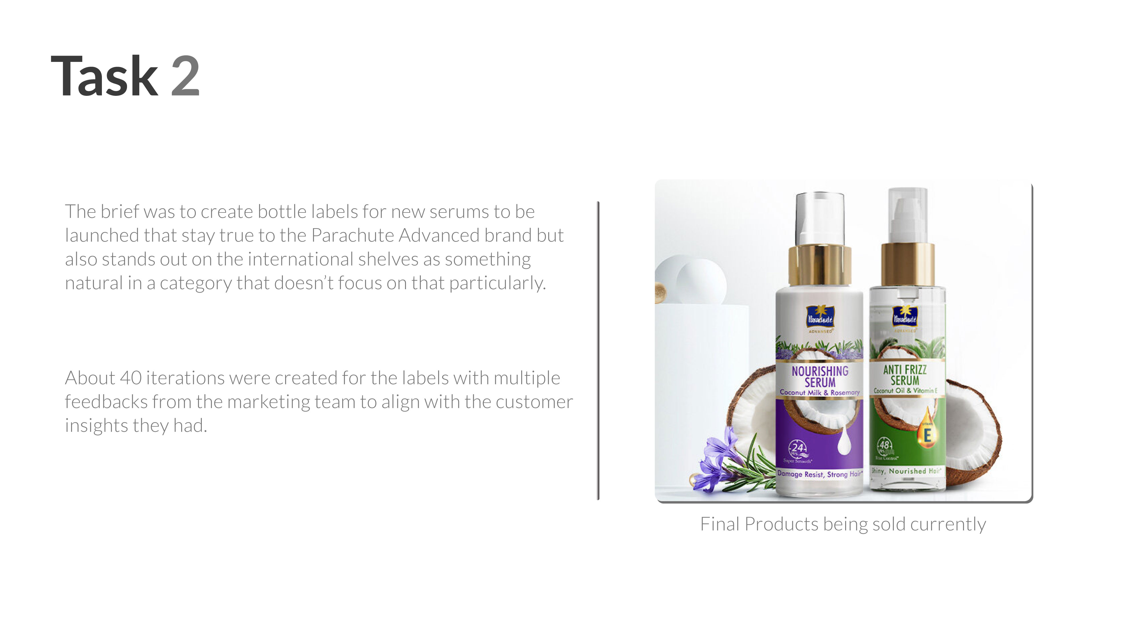 The work included packaging design for Parachute Advanced hair serums, some of which went on to be produced and are currently sold internationally. Alongside this were exploratory concepts for Saffola Honey pouches and Soya Bhurji packaging that remained unimplemented, reflecting the realities of corporate decision-making.