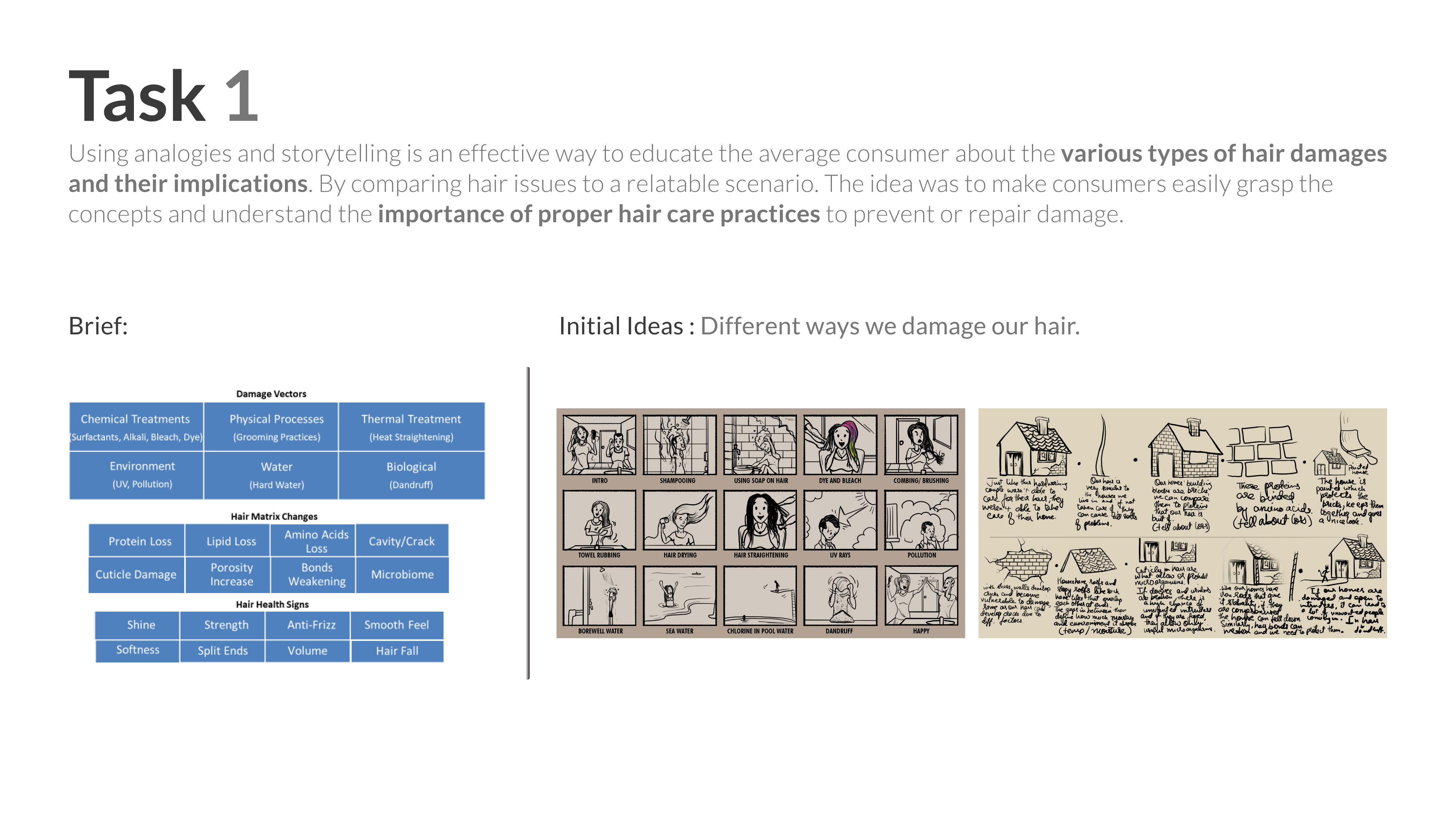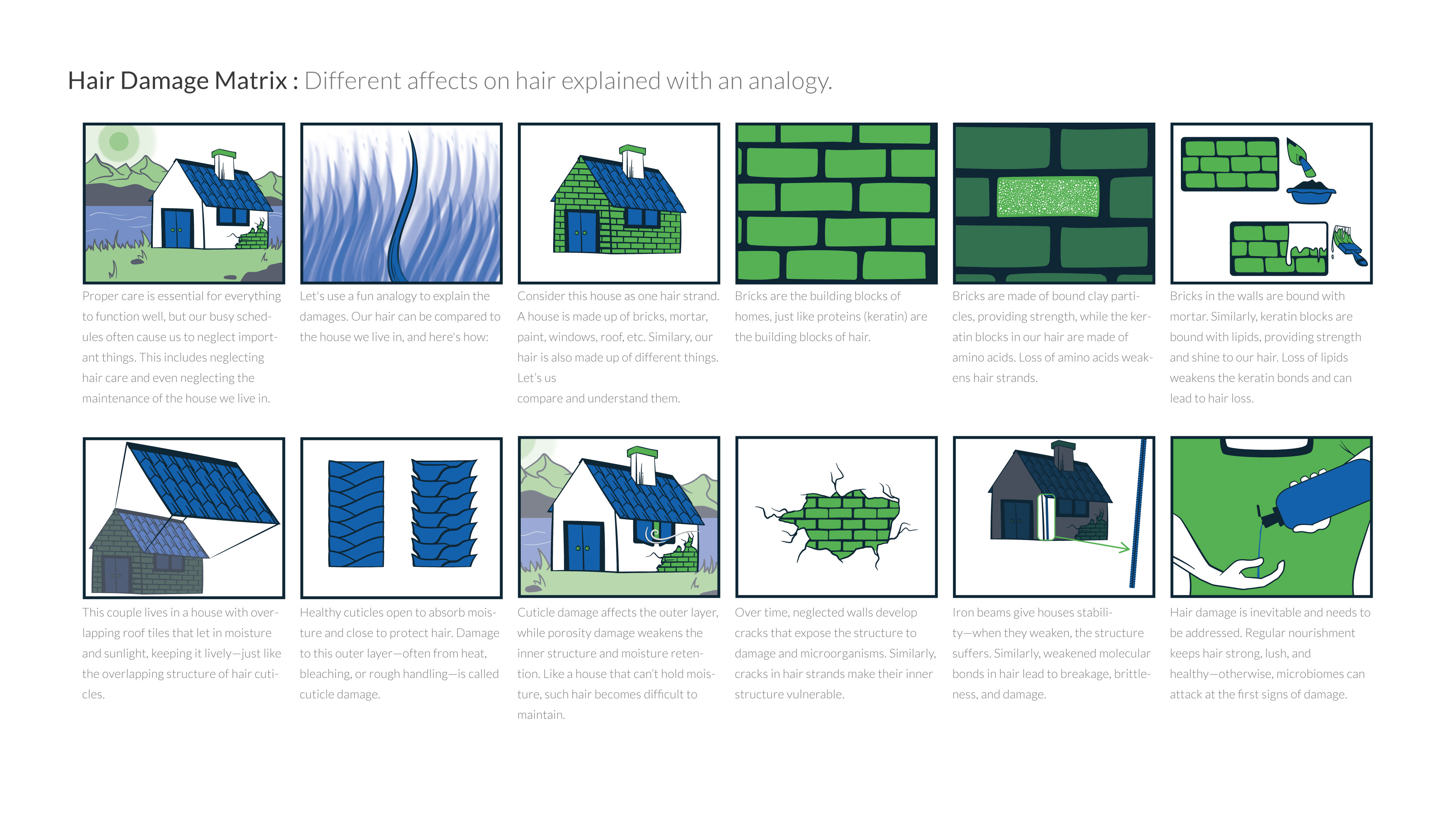 A key part of the internship involved developing an illustration system to explain hair damage and repair through a simple metaphor — treating hair like a house, where structure, protection, and maintenance determine long-term health. Built in collaboration with the R&D team, the system translated technical concepts into clear, accessible visual narratives, even though the larger product plan it supported did not move forward.
